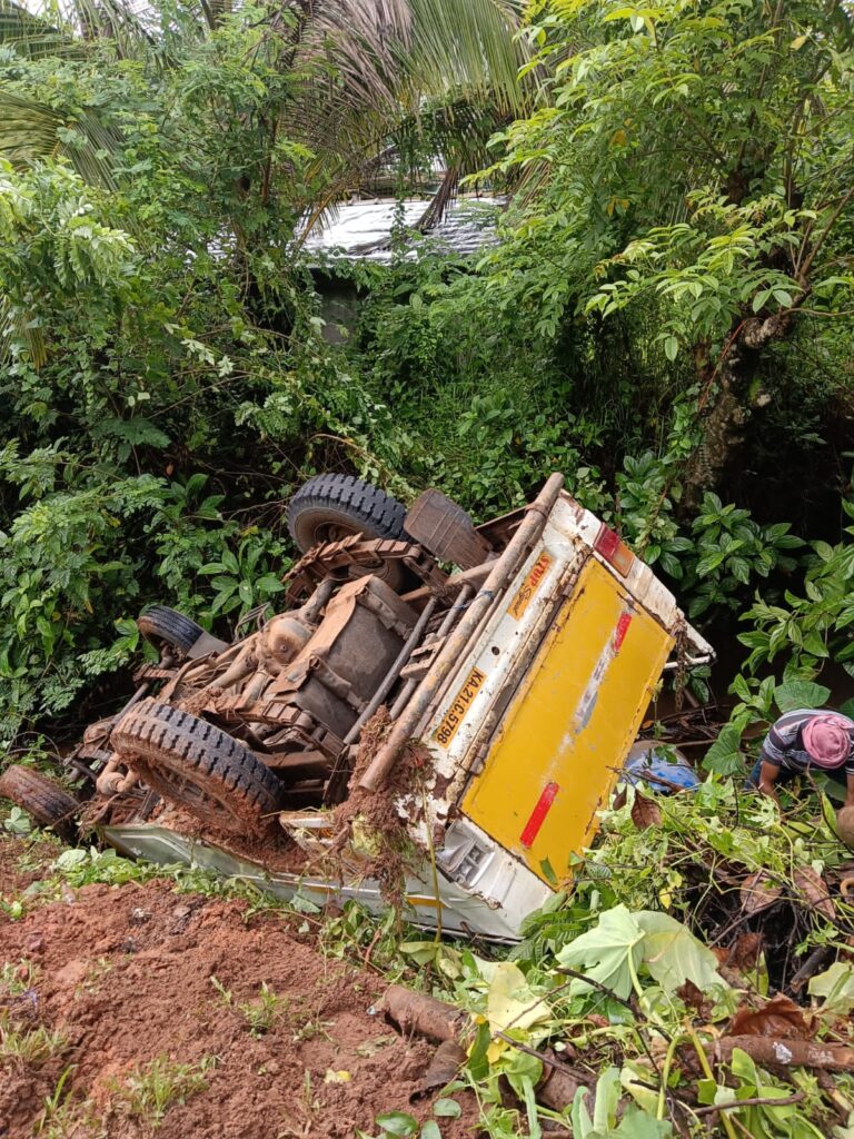 ಸಂಪಾಜೆಯಿಂದ ಅರಮನೆ ಎಂಬಲ್ಲಿಯ ತೋಟಕ್ಕೆ ಪಿಕಪ್ ನಲ್ಲಿ ಕೆಲಸದವನ್ನು ಮತ್ತು ಸಿಮೆಂಟ್ ಲೋಡ್ ಕೊಂಡೊಯ್ಯುವ ವೇಳೆ ಪೆಟ್ರೋಲ್ ಪಂಪ್ ತಿರುವಿನಲ್ಲಿ ಪಿಕಪ್ ಚಾಲಕನ ನಿಯಂತ್ರಣ ತಪ್ಪಿ ರಸ್ತೆಯ ಪಕ್ಕದ ಚರಂಡಿಗೆ ಪಲ್ಟಿಯಾಗಿದೆ. ಪರಿಣಾಮವಾಗಿ ಪಿಕಪ್ ವಾಹನದಲ್ಲಿರುವರು ಗಾಯಗೊಂಡು ಪ್ರಾಣಾಪಾಯದಿಂದ ಪಾರಾಗಿದ್ದಾರೆ.ಇದು