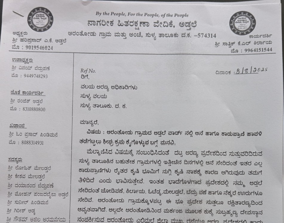 ಅರಂತೋಡು ಗ್ರಾಮದ ನಾಗರಿಕ ಹಿತರಕ್ಷಣಾ ವೇದಿಕೆಯ ವತಿಯಿಂದ ಸುಳ್ಯ ವಲಯಾರಣ್ಯಾಧಿಕಾರಿಗಳಿಗೆ ವಾರ್ಡಿನಲ್ಲಿ ಆಗುತ್ತಿರುವ ಕಾಡುಪ್ರಾಣಿಗಳ ಹಾವಳಿಯನ್ನು ನಿಯಂತ್ರಿಸಲು ಕ್ರಮ ಕೈಗೊಳ್ಳುವ ಕುರಿತು ಮನವಿ ಪತ್ರ ನೀಡಲಾಯಿತು.