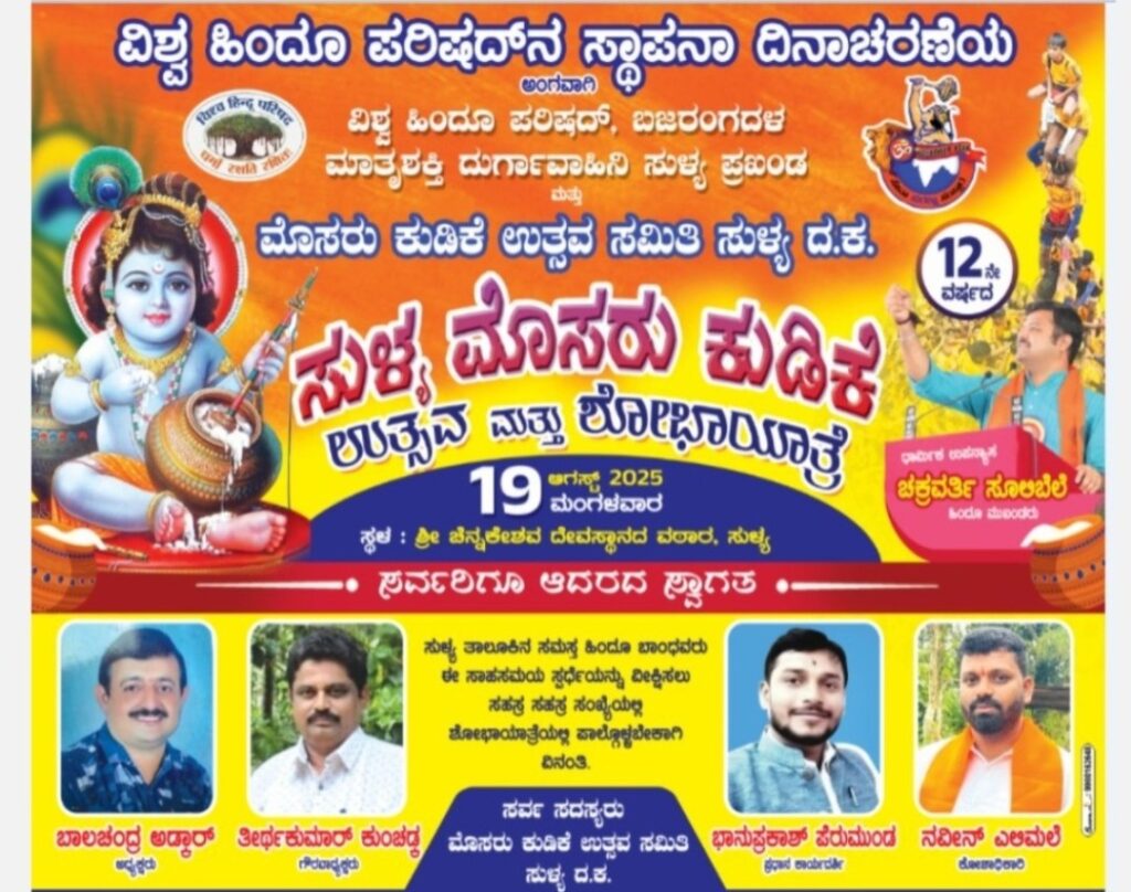 ವಿಶ್ವ ಹಿಂದೂ ಪರಿಷತ್ ನ ಸ್ಥಾಪನಾ ದಿನಾಚರಣೆಯ ಅಂಗವಾಗಿ ಸುಳ್ಯದಲ್ಲಿ ಹಿಂದೂ ಬಾಂಧವರನ್ನು ಸಂಘಟಿಸುವ ಸಲುವಾಗಿ ಶ್ರೀ ಕೃಷ್ಣ ಪರಮಾತ್ಮನ ಜನ್ಮ ದಿನಾಚರಣೆಯನ್ನು ಆಚರಿಸುವ ನಿಟ್ಟಿನಲ್ಲಿ ಶಾಂತಿ ಸುವ್ಯವಸ್ಥೆಯೊಂದಿಗೆ 12 ನೇ ವರ್ಷದ ಮೊಸರು ಕುಡಿಕೆ ಉತ್ಸವವನ್ನು ಅರ್ಥಪೂರ್ಣವಾದ ಶೋಭಾಯಾತ್ರೆ ಆಚರಣೆ ಇಂದು ಮಧ್ಯಾಹ್ನನತಂತರ ನಡೆಯಲಿದೆ.