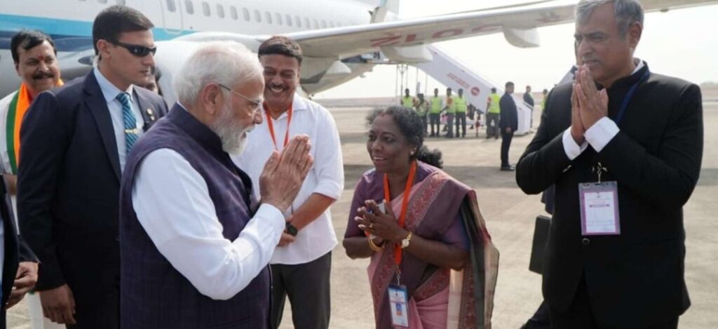 ಬೆಳಿಗ್ಗೆ 10.25ಕ್ಕೆ ಭಾರತೀಯ ವಾಯುಪಡೆ ವಿಮಾನದಲ್ಲಿ ಆಗಮಿಸಿದ ಪ್ರಧಾನಮಂತ್ರಿಗಳನ್ನು, ರಾಜ್ಯ ಸರಕಾರದ ಪರವಾಗಿ ಆರೋಗ್ಯ ಮತ್ತು ಜಿಲ್ಲಾ ಉಸ್ತುವಾರಿ ಸಚಿವ ದಿನೇಶ್ ಗುಂಡೂರಾವ್‌, ಸ್ವಾಗತಿಸಿದರು.