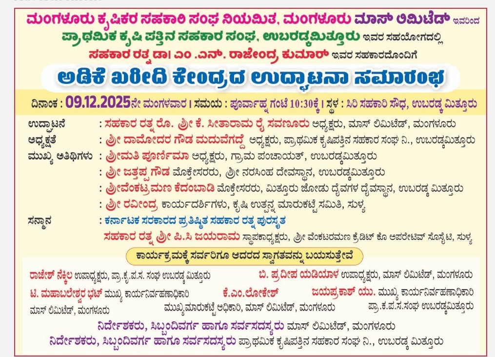 ಡಿ. 9: ಉಬರಡ್ಕದಲ್ಲಿ ಮಾಸ್ ಸಂಸ್ಥೆಯ ಅಡಿಕೆ ಖರೀದಿ ಕೇಂದ್ರ ಉದ್ಘಾಟನೆ