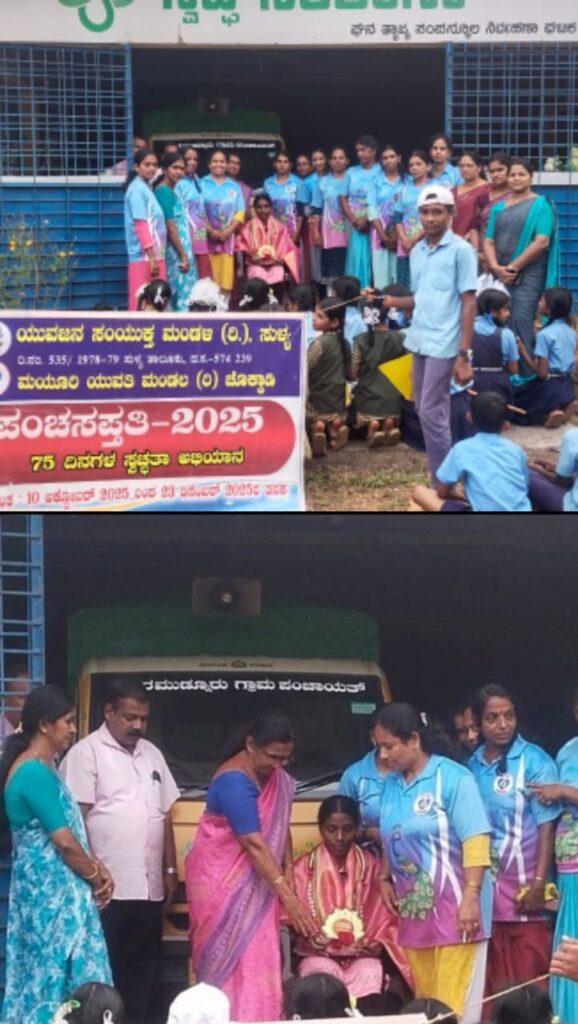 ಯುವಜನ ಸಂಯುಕ್ತ ಮಂಡಳಿ (ರಿ.), ಸುಳ್ಯ ಹಾಗೂ ಮಯೂರಿ ಯುವತಿ ಮಂಡಲ (ರಿ.), ಚೊಕ್ಕಾಡಿ ಇವರ ಸಂಯುಕ್ತ ಆಶ್ರಯದಲ್ಲಿ ಆಯೋಜಿಸಲಾದ “ಪಂಚ ಸಪ್ತತಿ ಸ್ವಚ್ಛತಾ ಅಭಿಯಾನ – 2025” ಕಾರ್ಯಕ್ರಮದ ಅಂಗವಾಗಿ ದಿನಾಂಕ 18-12-2025ರಂದು ಅಮರಪಡ್ನೂರು ಘನ ತ್ಯಾಜ್ಯ ಸಂಸ್ಕರಣಾ ಘಟಕದಲ್ಲಿ ಸೇವೆ ಸಲ್ಲಿಸುತ್ತಿರುವ ಶ್ರೀಮತಿ ಗೀತಾ ಅವರನ್ನು ಗೌರವಪೂರ್ವಕವಾಗಿ ಸನ್ಮಾನಿಸಲಾಯಿತು.
