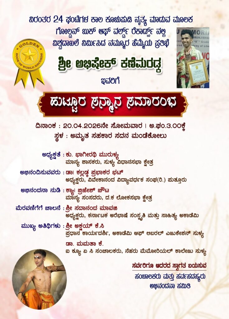 ಸುಳ್ಯ: ಕೂಚಿಪುಡಿ ನೃತ್ಯದಲ್ಲಿ ನಿರಂತರ 24 ಗಂಟೆಗಳ ಕಾಲ ನೃತ್ಯ ಮಾಡುವ ಮೂಲಕ ಗೋಲ್ಡನ್ ಬುಕ್ ಆಫ್ ವರ್ಲ್ಡ್ ರೆಕಾರ್ಡ್ಸ್ನಲ್ಲಿ ತನ್ನ ಹೆಸರನ್ನು ದಾಖಲಿಸಿ ವಿಶ್ವದಾಖಲೆ ನಿರ್ಮಿಸಿರುವ ಸುಳ್ಯದ ನೆಹರೂ ಮೆಮೋರಿಯಲ್ ಕಾಲೇಜಿನ ದ್ವಿತೀಯ ಬಿ.ಎಸ್ಸಿ ವಿದ್ಯಾರ್ಥಿ, ಮಂಡೆಕೋಲಿನ ಶ್ರೀ ಅಭಿಷೇಕ್ ಕಣೆಮರಡ್ಕ ಅವರಿಗೆ ಹುಟ್ಟೂರ ಸನ್ಮಾನ ಕಾರ್ಯಕ್ರಮವನ್ನು ಆಯೋಜಿಸಲಾಗಿದೆ.